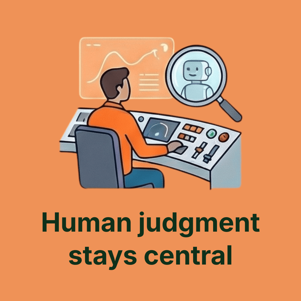 AI should be an assistant that offers insights, patterns, and prompts to better support understanding, curiosity, and building knowledge. People retain the authority to interpret context and challenge outputs. This keeps responsibility where it belongs and prevents “automation bias.”