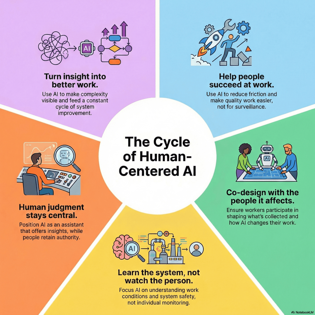 Design and use AI with both an organizational and worker-benefit purpose: reducing friction, making it easier to do quality and safe work, strengthening coordination, and improving systems. If the primary value is “surveillance, rank, detect, determine, enforce,” it’s not a human-centered use case.